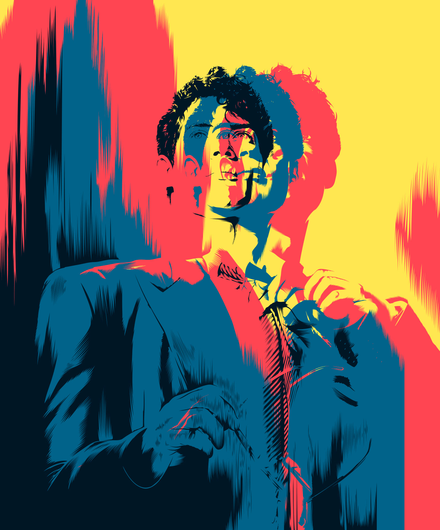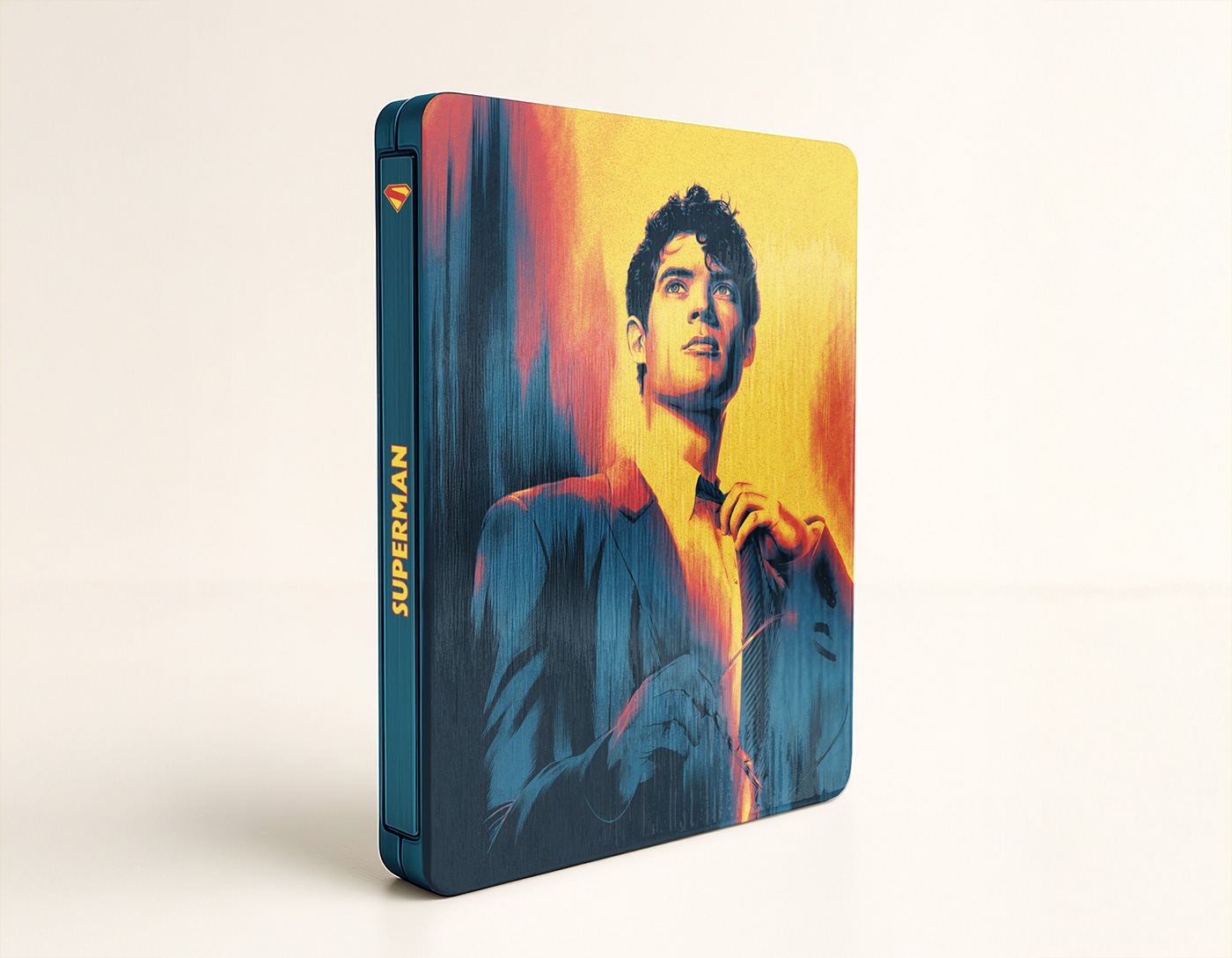 Illustration inspired by the latest Superman film directed by James Gunn, depicting Clark Kent without glasses in a moment of introspection. The primary colors of his suit dominate the composition, conveying energy, hope, and heroism. The piece aims to capture the human essence of the character before he becomes the iconic figure everyone knows.